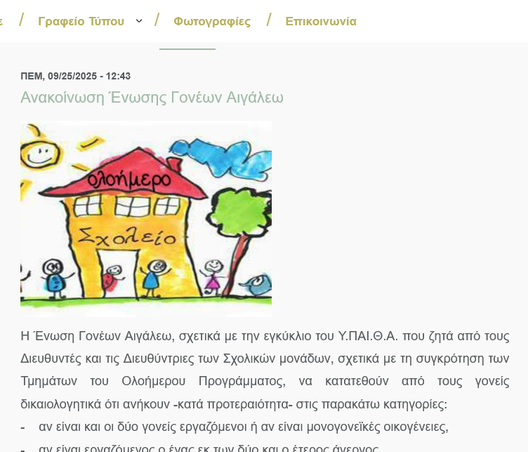 Η Ένωση Γονέων Αιγάλεω, σχετικά με την εγκύκλιο του Υ.ΠΑΙ.Θ.Α. που ζητά από τους Διευθυντές και τις Διευθύντριες των Σχολικών μονάδων, σχετικά με τη συγκρότηση των Τμημάτων του Ολοήμερου Προγράμματος, να κατατεθούν από τους γονείς δικαιολογητικά ότι ανήκουν -κατά προτεραιότητα- στις παρακάτω κατηγορίες: