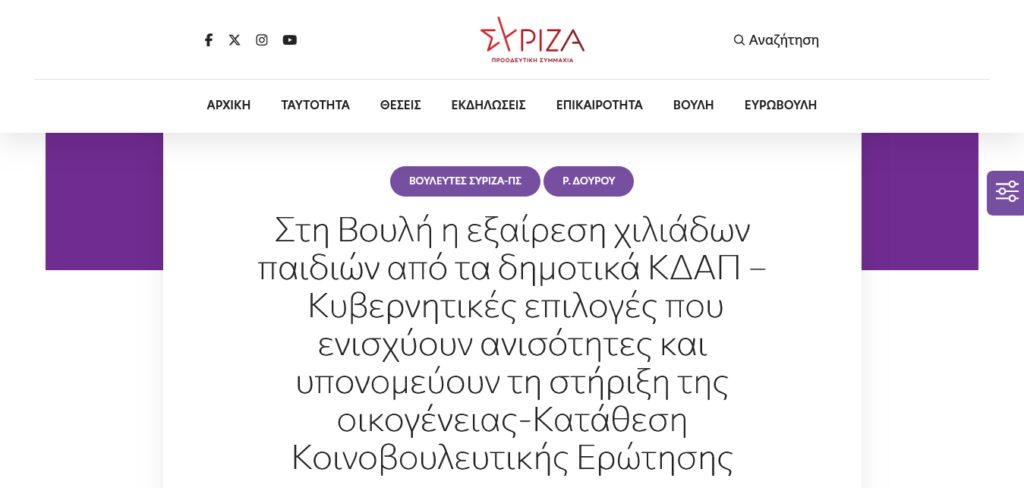 Θέμα: «Εξαίρεση χιλιάδων παιδιών από τα δημοτικά ΚΔΑΠ – Κυβερνητικές επιλογές που ενισχύουν ανισότητες και υπονομεύουν τη στήριξη της οικογένειας»