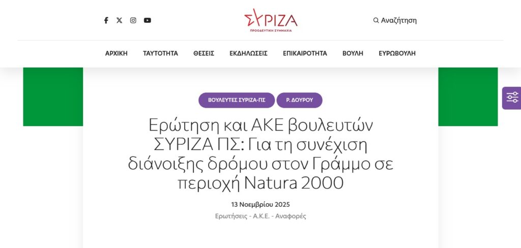 Πληθαίνουν οι πληροφορίες ότι εδώ και λίγες ημέρες μηχανήματα του στρατού ανέβηκαν στην κορυφογραμμή του Γράμμου και ξεκίνησαν και πάλι οι εργασίες για τη διάνοιξη δρόμου σε περιοχή ενταγμένη στο δίκτυο Natura 2000 (Ειδική Ζώνη Διατήρησης και Ζώνη Ειδικής Προστασίας με κωδικό GR1320003 – “Κορυφές Όρους Γράμμος”). Για το θέμα ο ΣΥΡΙΖΑ-ΠΣ είχε καταθέσει στις 9 Οκτωβρίου 2024 την υπ’ αριθ. Πρωτ. 135/9.10.2024 Ερώτηση Προς τον Υπουργό Περιβάλλοντος & Ενέργειας – https://www.hellenicparliament.gr/UserFiles/c0d5184d-7550-4265-8e0b-078e1bc7375a/12711423.pdf, με θέμα τη “Διάνοιξη νέου δρόμου στην περιοχή Natura Γράμμου χωρίς Περιβαλλοντική Μελέτη και χωρίς γνωστοποίηση”.