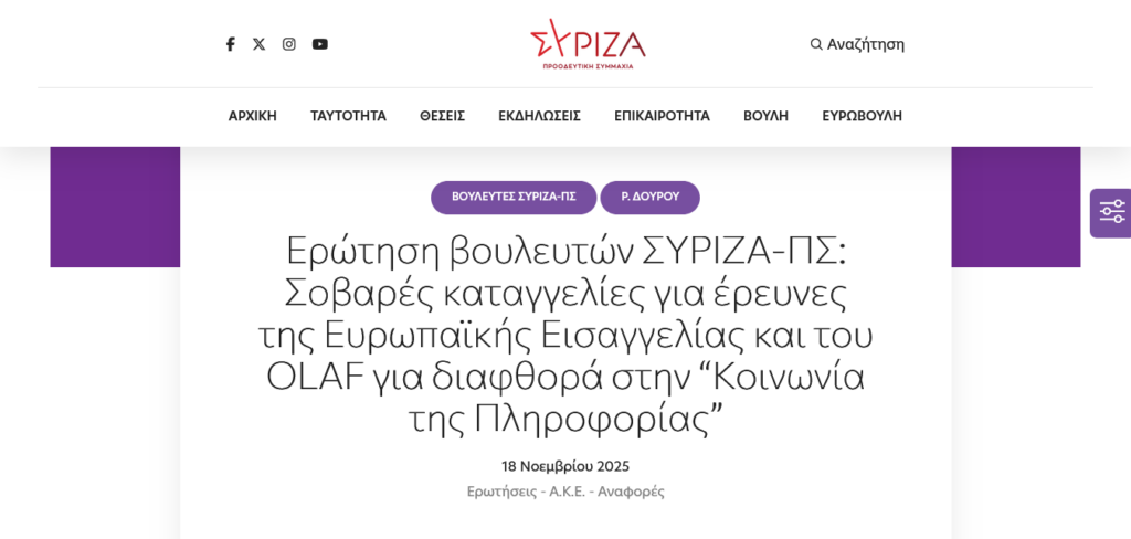 Νέο, ψηφιακό αυτή τη φορά, σκάνδαλο ερευνούν η Ευρωπαϊκή Εισαγγελία (EPPO) και το Γραφείο Ευρωπαϊκής Καταπολέμησης της Απάτης (OLAF) στην “Κοινωνία της Πληροφορίας Α.Ε.” (ΚτΠ), βραχίονα του Υπουργείου Ψηφιακής Διακυβέρνησης, που χειρίζεται δισεκατομμύρια από το ΕΣΠΑ για ψηφιακά έργα (gov.gr, Δι@ύγεια, ψηφιακές ταυτότητες, Προσωπικός Αριθμός, κα)! Συγκεκριμένα την υπόθεση της αιφνιδιαστικής έρευνας της EPPO και του OLAF στα γραφεία της Κοινωνίας της Πληροφορίας Α.Ε., φέρνουν στη Βουλή με Ερώτησή τους προς τον Υπουργό Ψηφιακής Διακυβέρνησης, βουλεύτριες και βουλευτές του ΣΥΡΙΖΑ-Π.Σ, με πρωτοβουλία της Ρένας Δούρου.