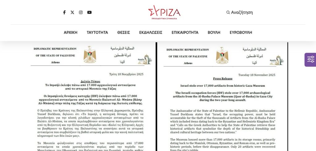 Τις Ελληνικές Αρχές καλεί ο Πρέσβης της Παλαιστίνης στην Ελλάδα, Yussef Dorkhom να βοηθήσουν στην ανάκτηση των κλαπέντων από το Ισραήλ ιστορικών αντικειμένων του Μουσείου Παλατιού Αλ- Μπάσα (Κάσρ Αλ-Μπάσα) στην πόλη της Γάζας, επισημαίνοντας ότι αυτά “τα ιστορικά αντικείμενα συμβολίζουν τη βαθιά ιστορική φιλία και την κοινή πολιτιστική κληρονομιά”. (https://bit.ly/4pm6Q1R). Σύμφωνα με την καταγγελία του “οι Ισραηλινές δυνάμεις κατοχής (IDF) έκλεψαν πάνω από 17.000 αρχαιολογικά αντικείμενα από το Μουσείο Παλατιού Αλ- Μπάσα (Κάσρ Αλ-Μπάσα) στην πόλη της Γάζας κατά τη διάρκεια της διετούς επίθεσης”.
