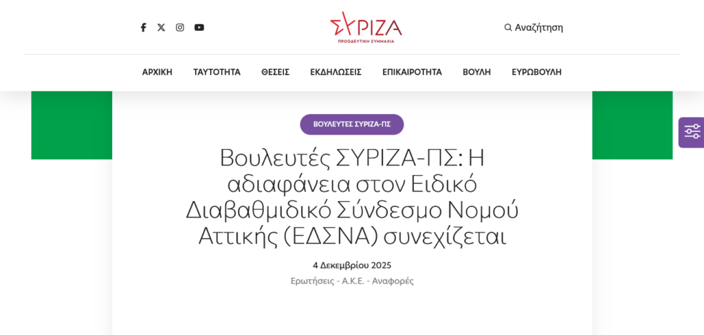 Θέμα: Η αδιαφάνεια στον Ειδικό Διαβαθμιδικό Σύνδεσμο Νομού Αττικής (ΕΔΣΝΑ) συνεχίζεται