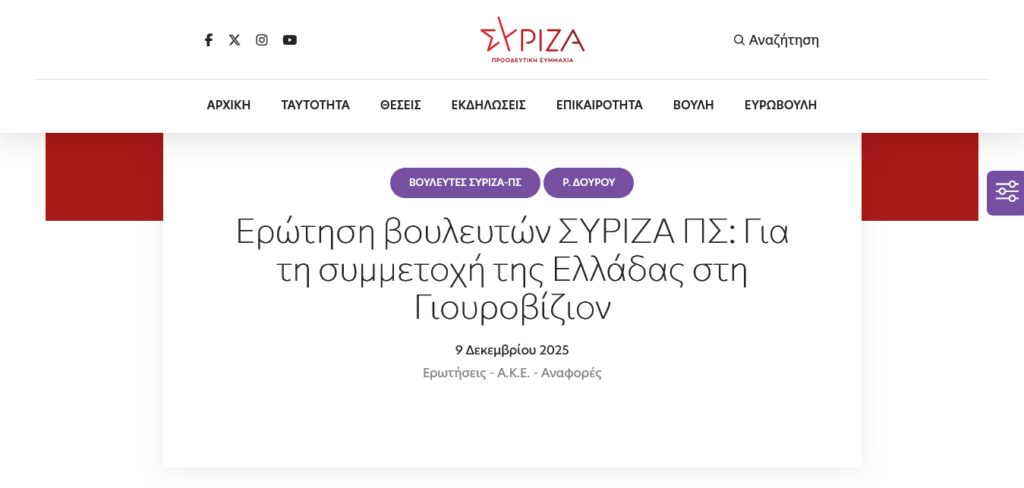 Γιατί η ΕΡΤ δεν ακολουθεί το παράδειγμα των δημόσιων τηλεοράσεων Ιρλανδίας, Ισπανίας, Ολλανδίας και Σλοβενίας και δεν αποσύρεται από τη Γιουροβίζιον του 2026 σε ένδειξη διαμαρτυρίας για τη συμμετοχή σε αυτήν του Ισραήλ; Το ερώτημα αυτό θέτουν προς τον Υφυπουργό στον Πρωθυπουργό, Π. Μαρινάκη, βουλεύτριες και βουλευτές του ΣΥΡΙΖΑ-Π.Σ., με πρωτοβουλία της Ρένας Δούρου, επισημαίνοντας τα δύο μέτρα και δύο σταθμά έναντι του Ισραήλ και της Ρωσίας, με το πρώτο να μετέχει κανονικά παρά τη γενοκτονία στη Γάζα ενώ η δεύτερη έχει αποκλειστεί επ’ αόριστον από το 2022 εξαιτίας της εισβολής στην Ουκρανία.