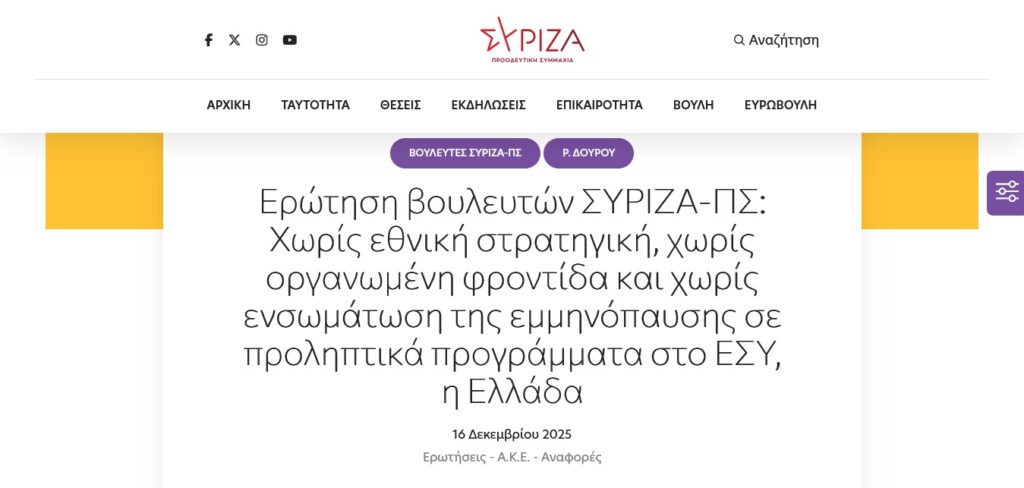 Θέμα: Χωρίς εθνική στρατηγική, χωρίς οργανωμένη φροντίδα και χωρίς ενσωμάτωση της εμμηνόπαυσης σε προληπτικά προγράμματα στο ΕΣΥ, η Ελλάδα
